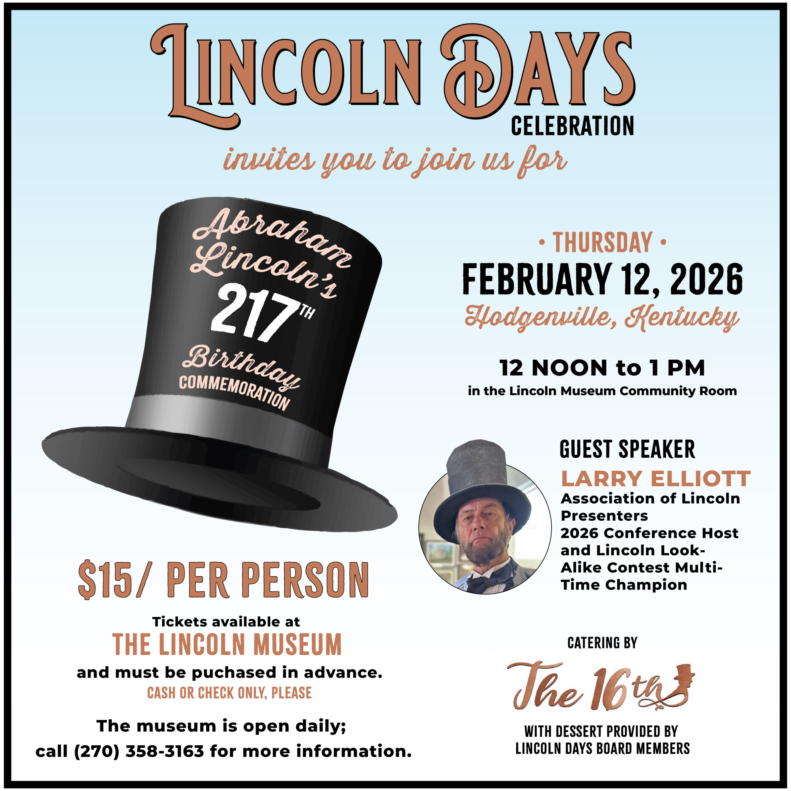 Lincoln Museum Community Room 56 Lincoln Square, Hodgenville, KY, United StatesThe annual Lincoln Days Celebration Luncheon commemorating the birth of Abraham Lincoln will be Thursday, February 12, 2026, in The Lincoln Museum Community Room (56 Lincoln Square) from 12 noon to 1 pm.